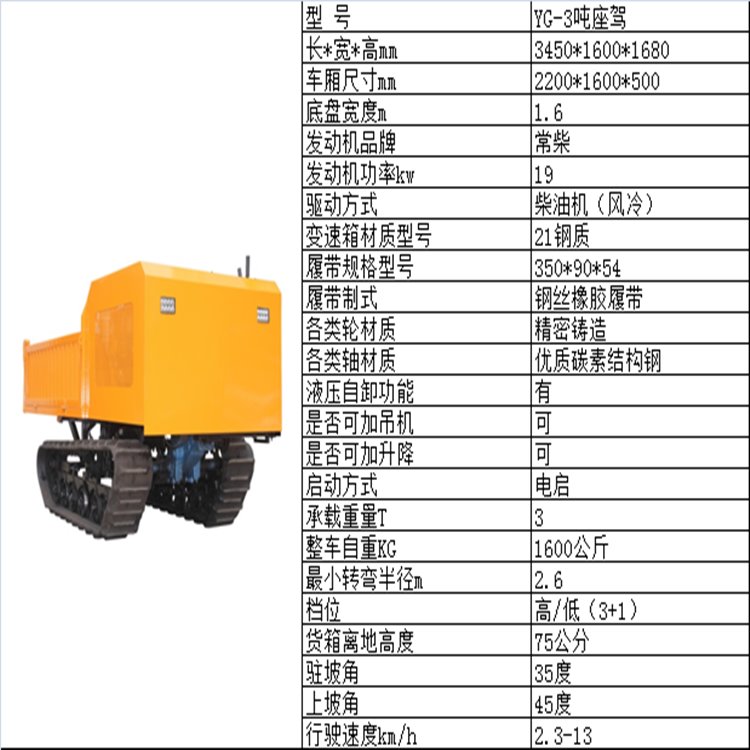 履带运输自卸车能适应水稻田、沼泽地、泥泞的田间道路、崎岖的山路、松软的草地和沙漠、湿滑的冰面和雪地等复杂恶劣路况,在农林果园运输、货场装载、水利建设、基建工程、矿山等场所应用广泛。
